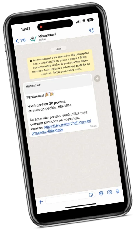 A cada compra o seu cliente recebe uma quantidade de pontos e é notificado pelo WhatsApp, junto a lista de produtos que podem ser trocados.